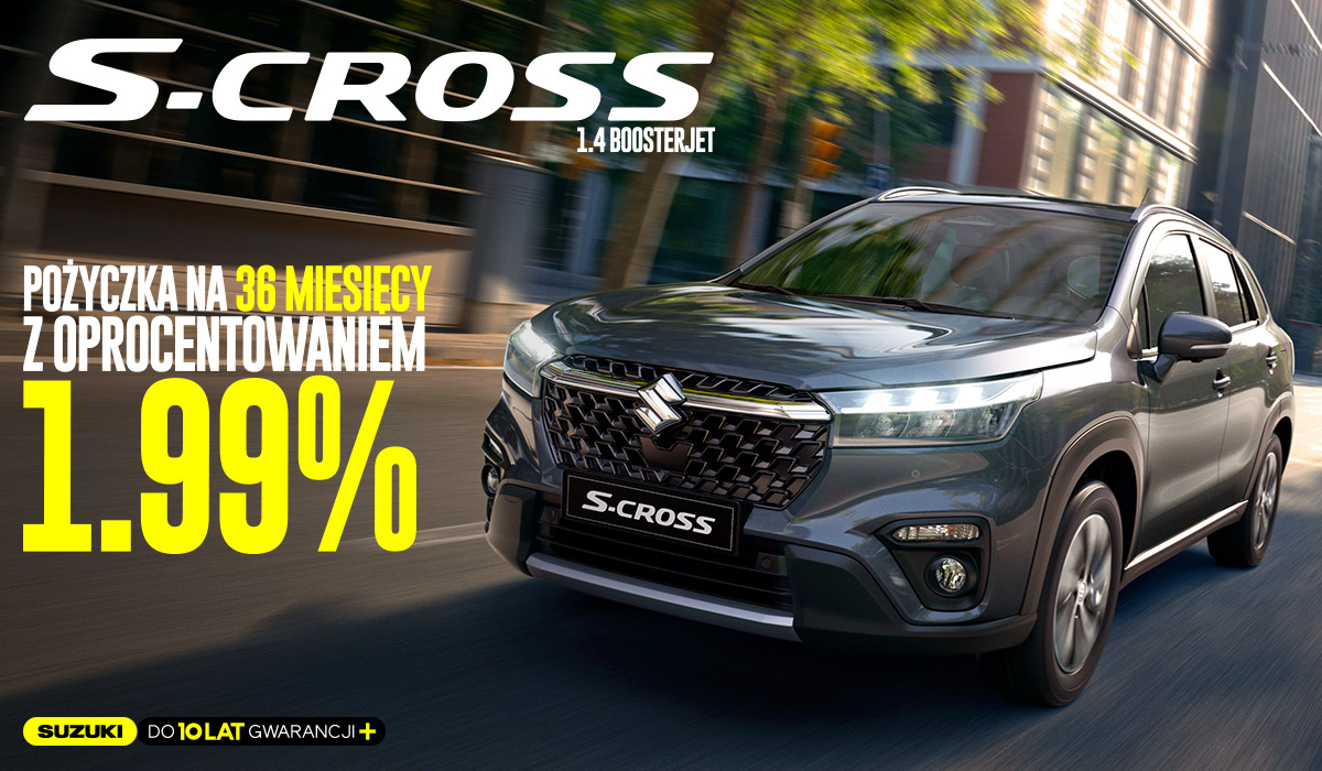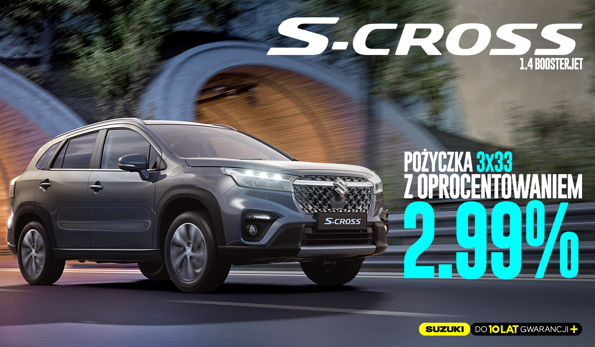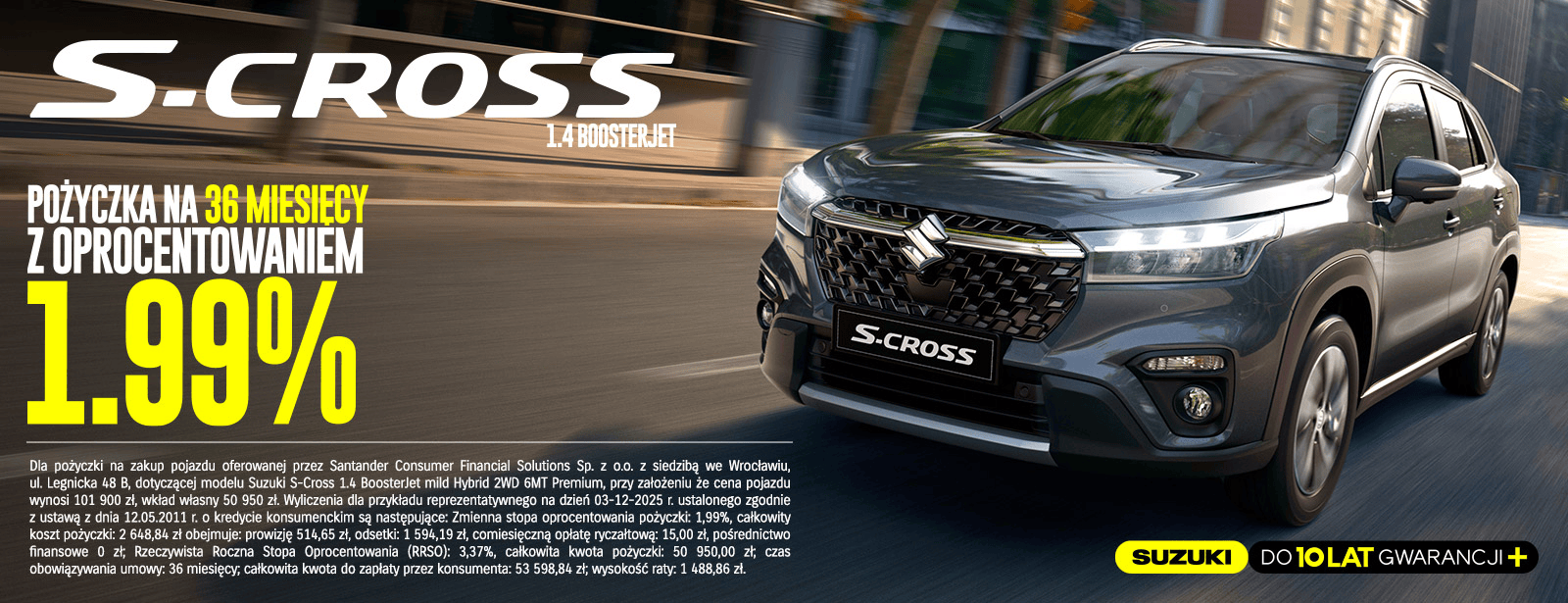 **dla modelu S-Cross 1.4 BoosterJet mild Hybrid. Pożyczka 3x33 - Dla pożyczki na zakup pojazdu oferowanej przez Santander Consumer Financial Solutions Sp. z o.o. z siedzibą we Wrocławiu, ul. Legnicka 48 B, dotyczącej modelu Suzuki S-Cross 1.4 BoosterJet mild Hybrid 2WD 6MT Premium, przy założeniu że cena pojazdu wynosi 101900 zł, wkład własny 33966,67 zł. wyliczenia dla przykładu reprezentatywnego na dzień 03-12-2025 r. ustalonego zgodnie z ustawą z dnia 12.05.2011 r. o kredycie konsumenckim są następujące: Zmienna stopa oprocentowania pożyczki: 2,99%, całkowity koszt pożyczki: 3782,63 zł obejmuje: prowizję 689,63 zł, odsetki: 3093,00 zł, opłatę ryczałtową zgodnie z harmonogramem: 0,00 zł, pośrednictwo finansowe 0 zł; Rzeczywista Roczna Stopa Oprocentowania (RRSO): 3,69%, całkowita kwota pożyczki: 68273,00 zł; czas obowiązywania umowy: 24 miesięcy; całkowita kwota do zapłaty przez konsumenta: 72055,63 zł; wysokość raty: 36543,28 zł.