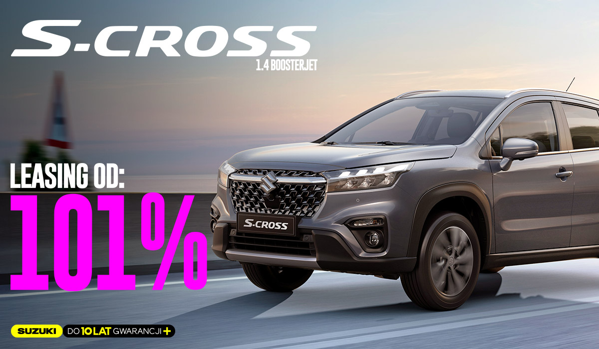 ***dla modelu S-Cross 1.4 BoosterJet mild Hybrid. Leasing 101% - Przykładowa kalkulacja leasingu dla przedsiębiorców oferowanego przez Santander Consumer Multirent Spółka z o.o. z siedzibą we Wrocławiu w ramach Suzuki Finance: cena zakupu pojazdu 82845,53 netto, opłata wstępna 45%, czas obowiązywania umowy 24 miesiące, produkt zawiera kartę paliwową. Niniejsza propozycja nie jest ofertą w rozumieniu przepisów Kodeksu Cywilnego i ma charakter wyłącznie informacyjny.